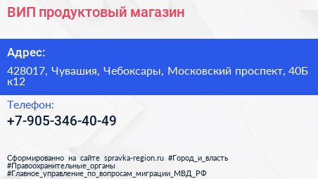 ВИП, продуктовый магазин по адресу 428017, Чувашия, Чебоксары, Московский проспект, 40Б к12 в дальнейшем Организация, размещена в следующих категориях: