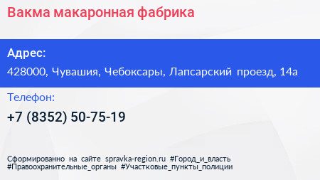 Вакма, макаронная фабрика по адресу 428000, Чувашия, Чебоксары, Лапсарский проезд, 14а в дальнейшем Организация, размещена в следующих категориях: