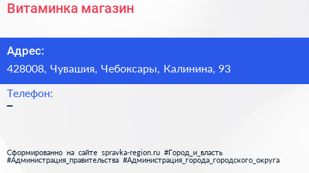 Витаминка, магазин по адресу 428008, Чувашия, Чебоксары, Калинина, 93 в дальнейшем Организация, размещена в следующих категориях: