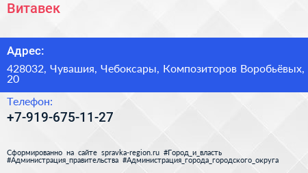 Витавек по адресу 428032, Чувашия, Чебоксары, Композиторов Воробьёвых, 20 в дальнейшем Организация, размещена в следующих категориях: