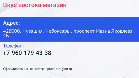 Вкус востока, магазин по адресу 428000, Чувашия, Чебоксары, проспект Ивана Яковлева, 4Б в дальнейшем Организация, размещена в следующих категориях: