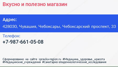 Вкусно и полезно, магазин по адресу 428030, Чувашия, Чебоксары, Чебоксарский проспект, 33 в дальнейшем Организация, размещена в следующих категориях:
