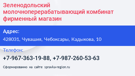 Зеленодольский молочноперерабатывающий комбинат, фирменный магазин по адресу 428031, Чувашия, Чебоксары, Кадыкова, 10 в дальнейшем Организация, размещена в следующих категориях:
