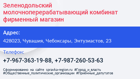 Зеленодольский молочноперерабатывающий комбинат, фирменный магазин по адресу 428023, Чувашия, Чебоксары, Энтузиастов, 23 в дальнейшем Организация, размещена в следующих категориях: