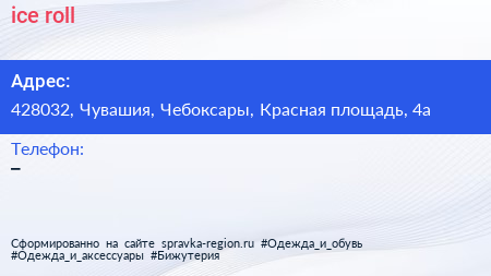 ice & roll по адресу 428032, Чувашия, Чебоксары, Красная площадь, 4а в дальнейшем Организация, размещена в следующих категориях: