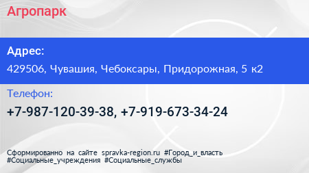 Агропарк по адресу 429506, Чувашия, Чебоксары, Придорожная, 5 к2 в дальнейшем Организация, размещена в следующих категориях: