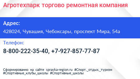 Агротехпарк, торгово-ремонтная компания по адресу 428024, Чувашия, Чебоксары, проспект Мира, 54а в дальнейшем Организация, размещена в следующих категориях: