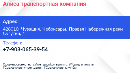 Алиса, транспортная компания по адресу 428010, Чувашия, Чебоксары, Правая Набережная реки Сугутки, 1 в дальнейшем Организация, размещена в следующих категориях: