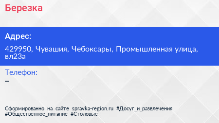 Березка по адресу 429950, Чувашия, Чебоксары, Промышленная улица, вл23а в дальнейшем Организация, размещена в следующих категориях: