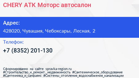 CHERY-АТК-Моторс, автосалон по адресу 428020, Чувашия, Чебоксары, Лесная, 2 в дальнейшем Организация, размещена в следующих категориях: