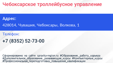 Чебоксарское троллейбусное управление по адресу 428014, Чувашия, Чебоксары, Волкова, 1 в дальнейшем Организация, размещена в следующих категориях: