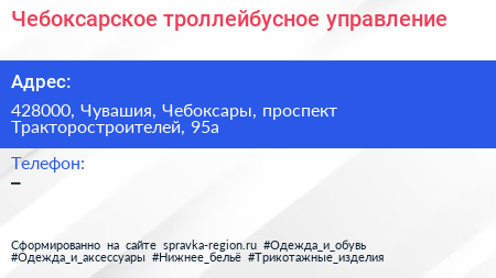 Чебоксарское троллейбусное управление по адресу 428000, Чувашия, Чебоксары, проспект Тракторостроителей, 95а в дальнейшем Организация, размещена в следующих категориях: