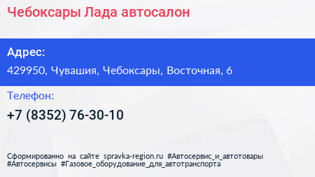 Чебоксары-Лада, автосалон по адресу 429950, Чувашия, Чебоксары, Восточная, 6 в дальнейшем Организация, размещена в следующих категориях: