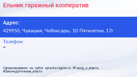Ельник, гаражный кооператив по адресу 429950, Чувашия, Чебоксары, 10 Пятилетки, 17г в дальнейшем Организация, размещена в следующих категориях: