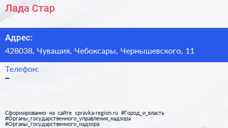 Лада-Стар по адресу 428038, Чувашия, Чебоксары, Чернышевского, 11 в дальнейшем Организация, размещена в следующих категориях: