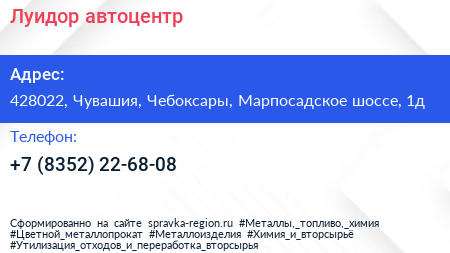 Луидор, автоцентр по адресу 428022, Чувашия, Чебоксары, Марпосадское шоссе, 1д в дальнейшем Организация, размещена в следующих категориях: