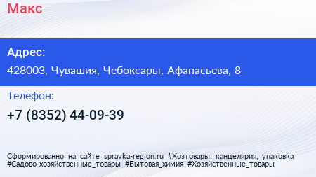 Макс по адресу 428003, Чувашия, Чебоксары, Афанасьева, 8 в дальнейшем Организация, размещена в следующих категориях: