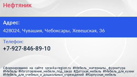 Нефтяник по адресу 428024, Чувашия, Чебоксары, Хевешская, 36 в дальнейшем Организация, размещена в следующих категориях: