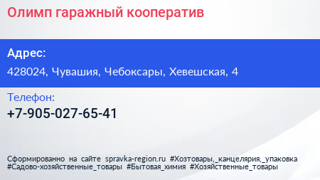 Олимп, гаражный кооператив по адресу 428024, Чувашия, Чебоксары, Хевешская, 4 в дальнейшем Организация, размещена в следующих категориях: