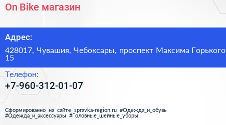 On Bike, магазин по адресу 428017, Чувашия, Чебоксары, проспект Максима Горького, 15 в дальнейшем Организация, размещена в следующих категориях:
