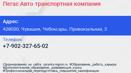 Пегас-Авто, транспортная компания по адресу 428020, Чувашия, Чебоксары, Привокзальная, 3 в дальнейшем Организация, размещена в следующих категориях: