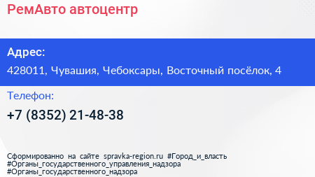 РемАвто, автоцентр по адресу 428011, Чувашия, Чебоксары, Восточный посёлок, 4 в дальнейшем Организация, размещена в следующих категориях: