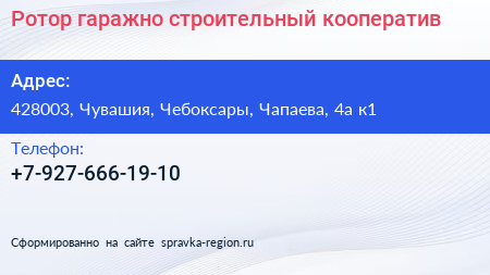 Ротор, гаражно-строительный кооператив по адресу 428003, Чувашия, Чебоксары, Чапаева, 4а к1 в дальнейшем Организация, размещена в следующих категориях: