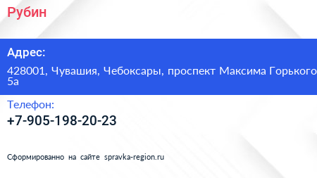Рубин по адресу 428001, Чувашия, Чебоксары, проспект Максима Горького, 5а в дальнейшем Организация, размещена в следующих категориях: