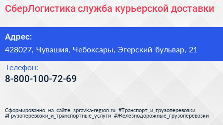 СберЛогистика, служба курьерской доставки по адресу 428027, Чувашия, Чебоксары, Эгерский бульвар, 21 в дальнейшем Организация, размещена в следующих категориях: