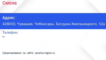 Смена по адресу 428010, Чувашия, Чебоксары, Богдана Хмельницкого, 12а в дальнейшем Организация, размещена в следующих категориях: