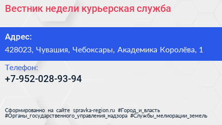 Вестник недели, курьерская служба по адресу 428023, Чувашия, Чебоксары, Академика Королёва, 1 в дальнейшем Организация, размещена в следующих категориях: