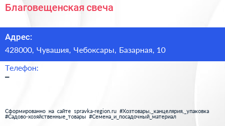 Благовещенская свеча по адресу 428000, Чувашия, Чебоксары, Базарная, 10 в дальнейшем Организация, размещена в следующих категориях: