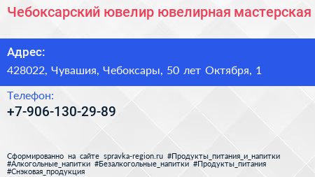 Чебоксарский ювелир, ювелирная мастерская по адресу 428022, Чувашия, Чебоксары, 50 лет Октября, 1 в дальнейшем Организация, размещена в следующих категориях:
