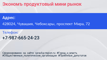 Экономъ, продуктовый мини-рынок по адресу 428024, Чувашия, Чебоксары, проспект Мира, 72 в дальнейшем Организация, размещена в следующих категориях: