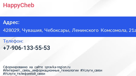 HappyCheb по адресу 428029, Чувашия, Чебоксары, Ленинского Комсомола, 21а в дальнейшем Организация, размещена в следующих категориях: