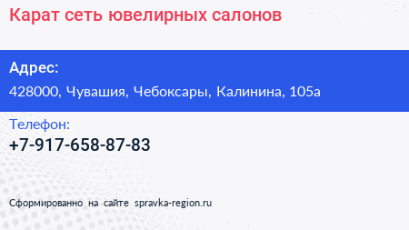Карат, сеть ювелирных салонов по адресу 428000, Чувашия, Чебоксары, Калинина, 105а в дальнейшем Организация, размещена в следующих категориях: