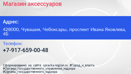 Магазин аксессуаров по адресу 428000, Чувашия, Чебоксары, проспект Ивана Яковлева, 4Б в дальнейшем Организация, размещена в следующих категориях: