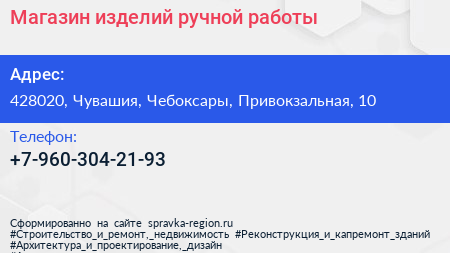 Магазин изделий ручной работы по адресу 428020, Чувашия, Чебоксары, Привокзальная, 10 в дальнейшем Организация, размещена в следующих категориях: