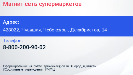 Магнит, сеть супермаркетов по адресу 428022, Чувашия, Чебоксары, Декабристов, 14 в дальнейшем Организация, размещена в следующих категориях: