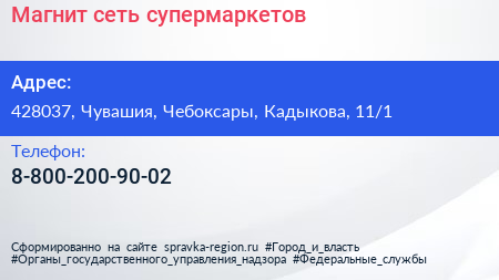Магнит, сеть супермаркетов по адресу 428037, Чувашия, Чебоксары, Кадыкова, 11/1 в дальнейшем Организация, размещена в следующих категориях: