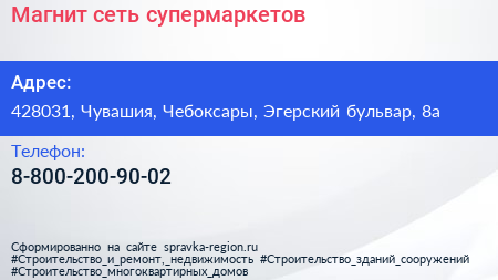 Магнит, сеть супермаркетов по адресу 428031, Чувашия, Чебоксары, Эгерский бульвар, 8а в дальнейшем Организация, размещена в следующих категориях: