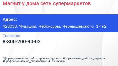 Магнит у дома, сеть супермаркетов по адресу 428038, Чувашия, Чебоксары, Чернышевского, 17 к2 в дальнейшем Организация, размещена в следующих категориях: