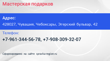 Мастерская подарков по адресу 428027, Чувашия, Чебоксары, Эгерский бульвар, 42 в дальнейшем Организация, размещена в следующих категориях: