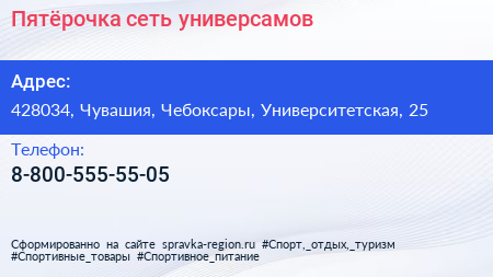 Пятёрочка, сеть универсамов по адресу 428034, Чувашия, Чебоксары, Университетская, 25 в дальнейшем Организация, размещена в следующих категориях: