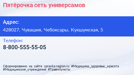 Пятёрочка, сеть универсамов по адресу 428027, Чувашия, Чебоксары, Кукшумская, 5 в дальнейшем Организация, размещена в следующих категориях:
