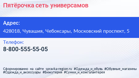 Пятёрочка, сеть универсамов по адресу 428018, Чувашия, Чебоксары, Московский проспект, 5 в дальнейшем Организация, размещена в следующих категориях: