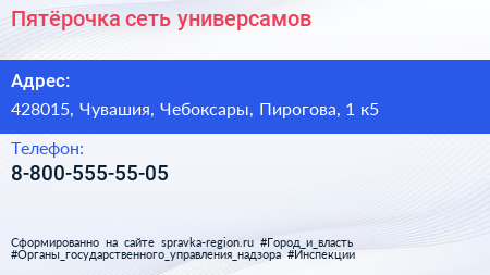 Пятёрочка, сеть универсамов по адресу 428015, Чувашия, Чебоксары, Пирогова, 1 к5 в дальнейшем Организация, размещена в следующих категориях: