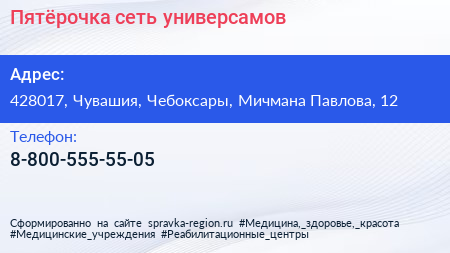 Пятёрочка, сеть универсамов по адресу 428017, Чувашия, Чебоксары, Мичмана Павлова, 12 в дальнейшем Организация, размещена в следующих категориях: