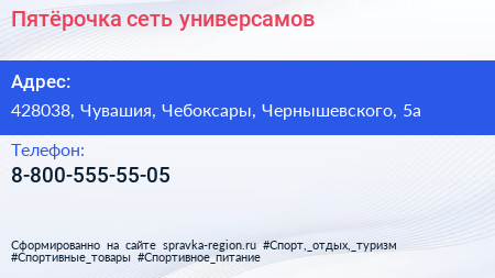 Пятёрочка, сеть универсамов по адресу 428038, Чувашия, Чебоксары, Чернышевского, 5а в дальнейшем Организация, размещена в следующих категориях: