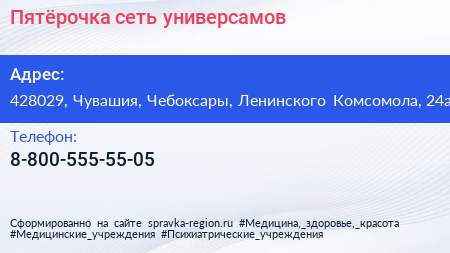 Пятёрочка, сеть универсамов по адресу 428029, Чувашия, Чебоксары, Ленинского Комсомола, 24а в дальнейшем Организация, размещена в следующих категориях: